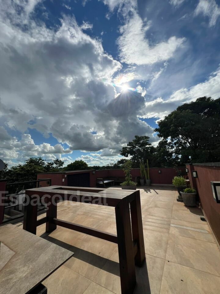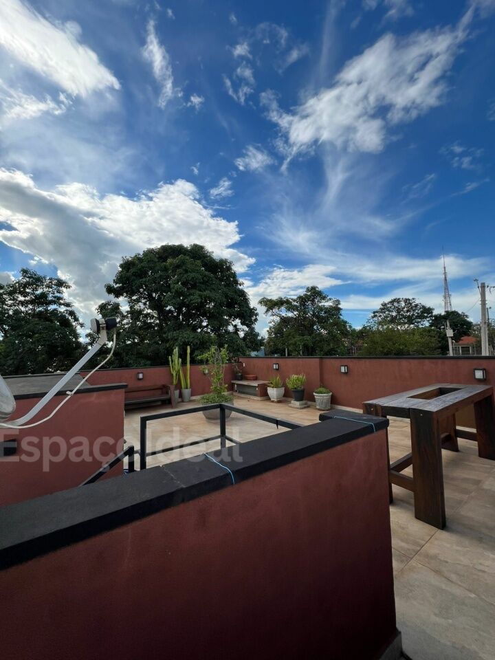 No piso superior, conta com área de lazer equipada com mesas e churrasqueira.